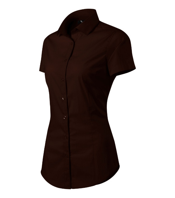 jemný strečový materiál projmutý střih s bočními švy dvojité sedlo na zadním dílu pasové a prsní záševky dvoudílný košilový límec přední kraje začištěny légou perleťové knoflíčky v barvě materiálu (1 náhradní navíc) tvarovaný dolní kraj