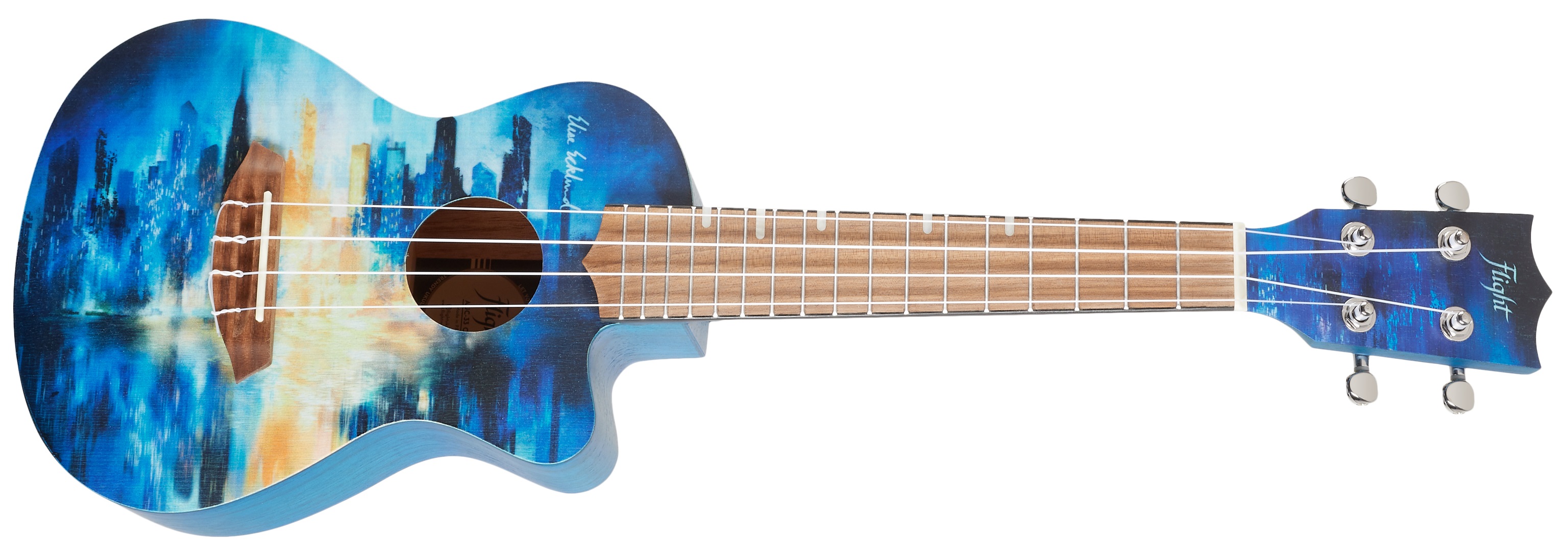 Akustické ukulele Akustické koncertní ukulele Elise Ecklund City Ukulele je signature modelem mladé ukulelistky Elise Ecklund. Tělo ukulele je složeno z přední desky z laminovaného smrku a zadní desky a lubů z laminovaného okoumé. Top zdobí design inspirovaný zážitky a krásou měst, která Elise Ecklund navštívila. Ke krku z okoumé je přilepen ořechový hmatník osazený sedmnácti pražci. Dohmat na vyšších polohách hmatníku usnadňuje spodní výřez těla. Struny jsou ukotveny přes nultý a sedlový pražec z kosti v l