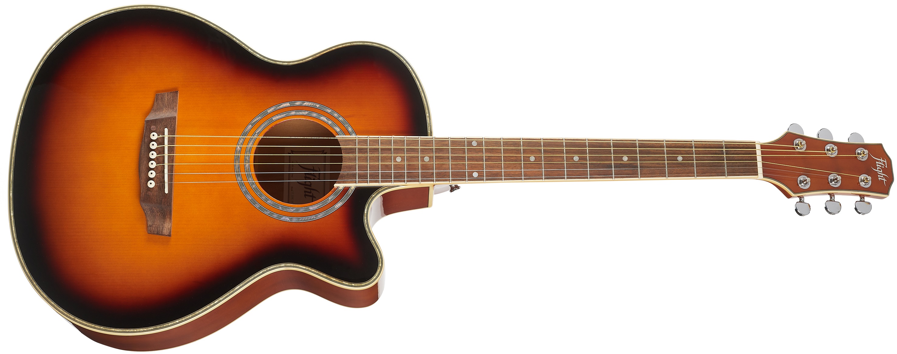 Akustická kytara Akustická kytara Flight F-230C SB je cenově dostupný nástroj vhodný pro začínající hráče. Nabízí vrstvený korpus s přední smrkovou deskou a zadní deskou a luby z akácie, krk z okoumé a hmatník ze dřeva kabukalli osazený jednadvaceti pražci. Dohmat na vyšších polohách hmatníku usnadňuje spodní výřez těla. Struny jsou uchyceny ve firemních chromovaných die-cast mechanikách. Stylové zpracování podtrhují tradiční prvky v podobě oboustranné obvodové lemovky těla a rozety.