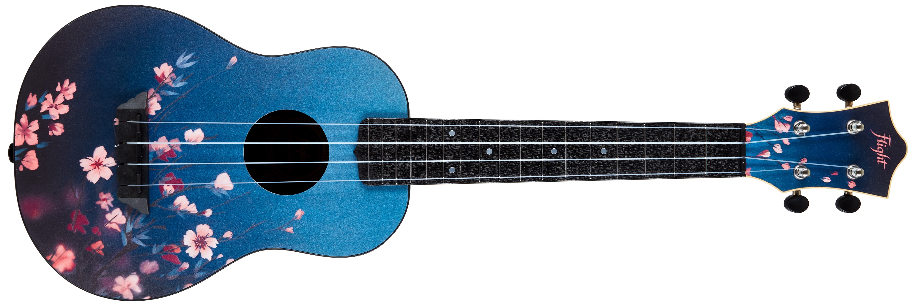 Akustické ukulele Řada Travel Series značky Flight nabízí cenově dostupné modely ukulelí zhotovených z větší části z plastového materiálu ABS, díky čemu bez úhony přežijí vaše výkyvy nálad i rozmary počasí. Korpus tohoto koncertního ukulele je složen z plastového těla a přední desky z laminované lípy, kterou zdobí grafické motivy. Širší klenutá zadní deska ukulele umožňuje nástroji rezonovat jasnějším hlasitějším zvukem, než nabízí standardní koncertní modely. Krk i hmatník jsou rovněž zhotoveny z plastovéh