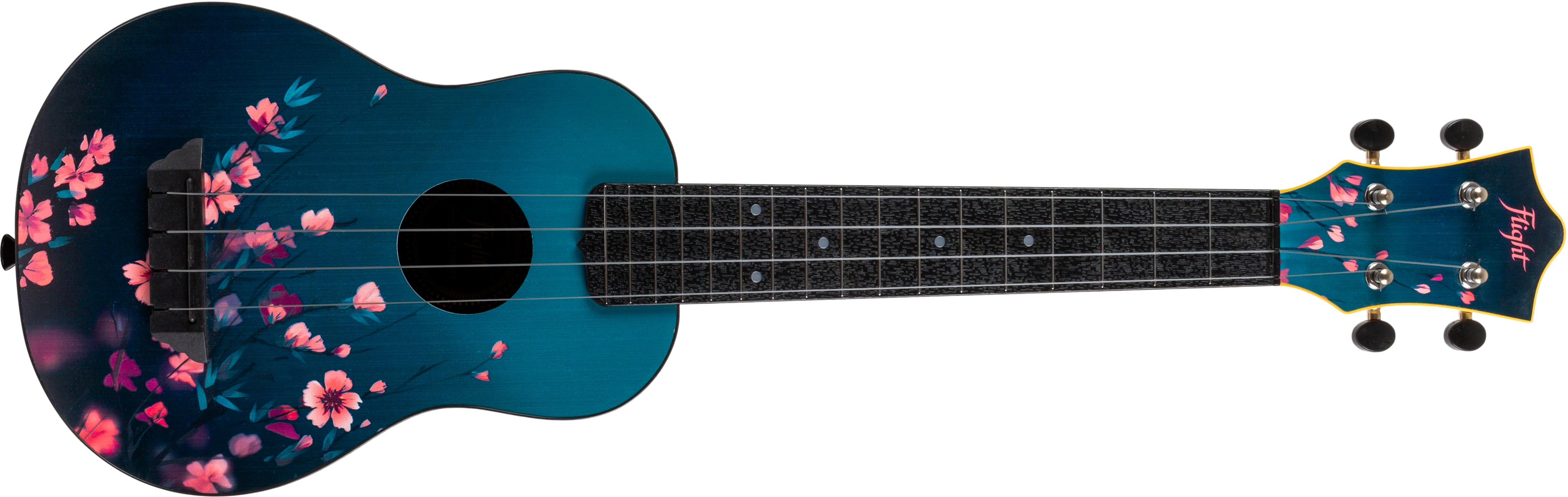 Akustické ukulele Řada Travel Series značky Flight nabízí cenově dostupné modely ukulelí zhotovených z větší části z plastového materiálu ABS, díky čemu bez úhony přežijí vaše výkyvy nálad i rozmary počasí. Model TUSL-32 SAKURA spojuje kompaktní tělo sopránového ukulele s delším krkem/menzurou koncertních ukulelí. Korpus ukulele je složen z plastového těla a přední desky z laminované lípy, kterou zdobí grafické motivy. Širší klenutá zadní deska ukulele umožňuje nástroji rezonovat jasnějším hlasitějším zvuke