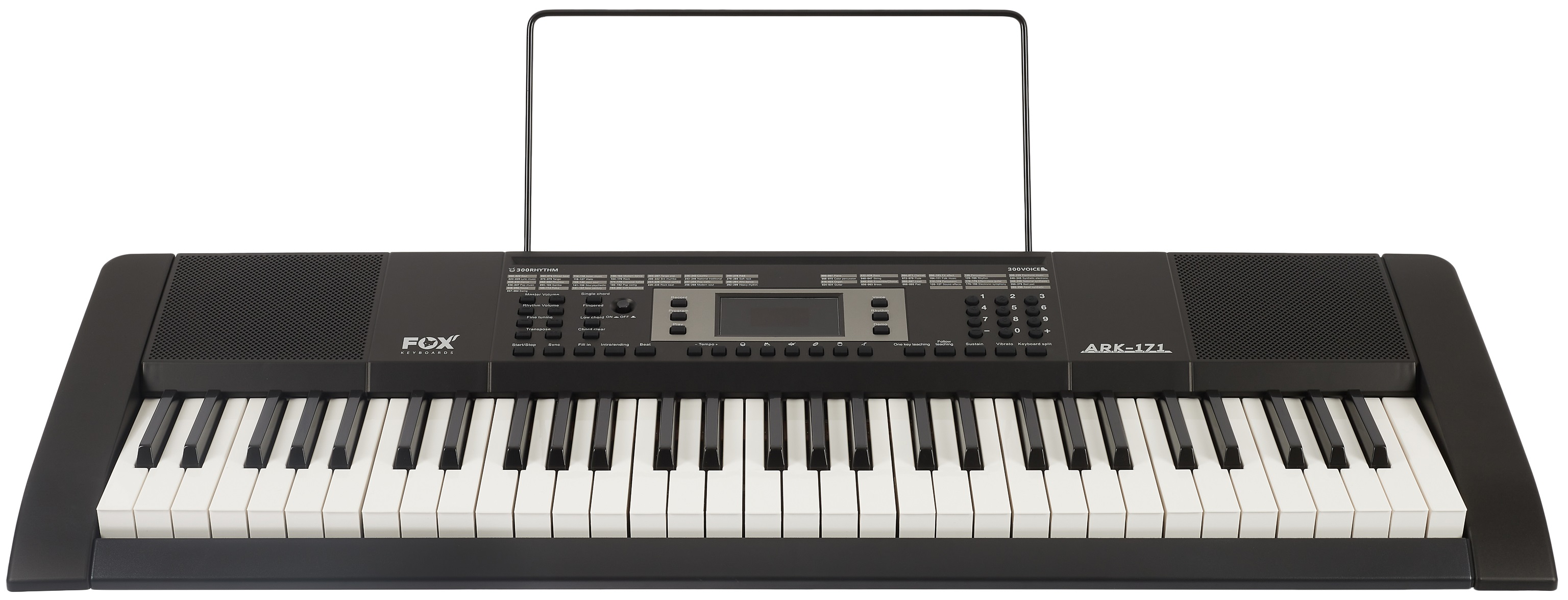 Klávesy bez dynamiky FOX Keyboards ARK-171 je multifunkční keyboard se 61 standardními klávesami, mechanikou bez dynamiky úhozu a centrálním LED displejem. Tento cenově dostupný nástroj skvěle poslouží pro první seznámení s elektronickými keyboardy, přičemž nabízí poměrně rozsáhlou knihovnu se 300 zvuky, dále 300 rytmických doprovodů, 40 demo songů a 6 panelů s perkusemi. To, že FOX AKR-171 není žádnou hračkou potvrzuje výčet dalších pokročilých funkcí, kterými většinou disponují mnohem dra