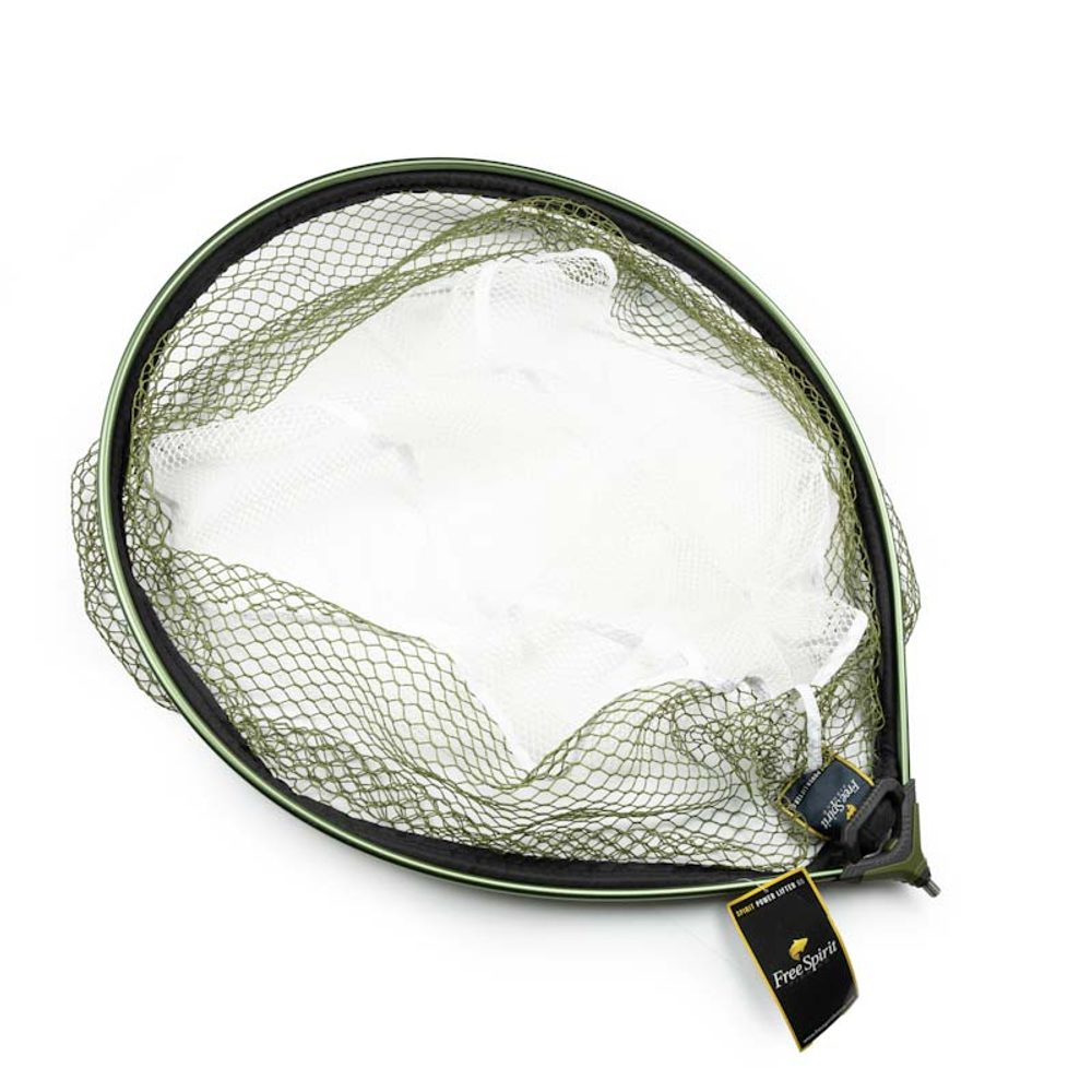 Oválná podběráková hlava určená pro většinu běžných ryb, s pogumovanou PVC sítí, pevným eloxovaným rámem a Power Lifter blokem. Podběráková hlava Spirit Power Lifter Spoon byla navržena tak, aby vyhovovala rekreačním i závodním rybářům, kteří požadují odolnost a spolehlivou manipulaci s rybou. Oválný tvar s roztečí 65 cm od rozpěrky k přednímu rámu poskytuje dostatek prostoru pro pohodlné podebírání většiny ryb kromě těch největších. Kombinace hrubší horní síťoviny pro lepší proudění vody a jemnější spodní části omezuje zachytávání háčků a vlasových návazců. Konstrukci doplňuje zeleně eloxovaný kovový rám, nerezový závit a masivní rozpěrný blok Power Lifter, který usnadňuje bezpečné zvedání ryby. Podběráková hlava je určena především pro použití s match rukojetěmi Free Spirit.