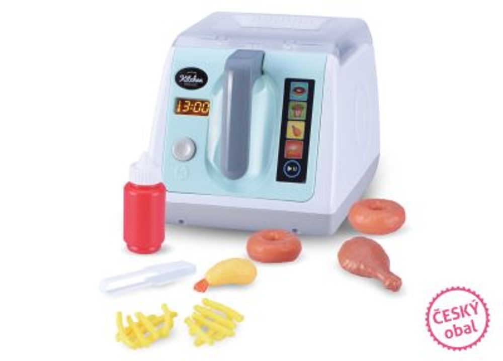 Fritovací hrnec, 2x hranolky, 1x kuřecí stehno, 1x kreveta, 2x donuty, naběračka, kečup, zvukové a světelné efekty, časovač. 2xAA baterie součástí. Máš chuť na křupavé smažené jídlo? Připrav si ve fritovacím hrnci hranolky s kečupem, donuty, krevety nebo kuřecí stehno. Pozvi své kamarády a společně si pochutnejte na dobrotách, které s novým fritovacím hrncem připravíš! Fritéza při smažení svítí a vydává zvuky jako opravdová a nechybí ani časovač! Tak dobrou chuť! Součástí balení: 2x hranolky 1x kuřecí…
