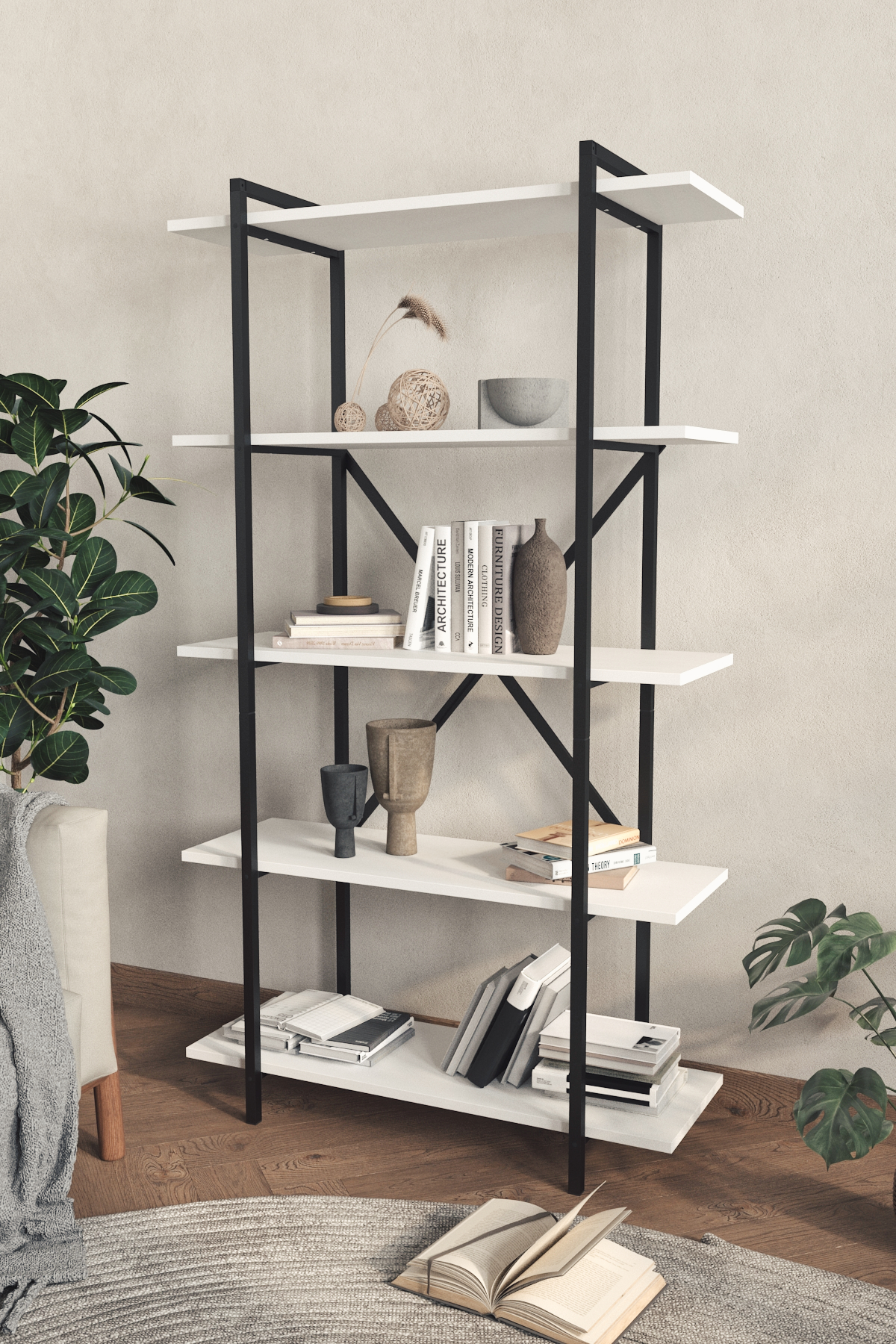 Knihovna NEVKA - bílá Vneste do svého obývacího pokoje vkus a eleganci s praktickou loftovou knihovnou NEVKA. Svým moderním a elegantním industriálním stylem dokonale zapadne do každého interiéru. 5 prostorných polic a odolný kovový rám zajistí jak spoustu úložného prostoru navíc, tak dlouhotrvající používání po mnoho let. Na výběr ve třech nejpopulárnějších barevných provedeních - dub safír, bílá a antracit. PROVEDENÍ dodáváno v rozloženém stavu knihovna je vyrobena z 18mm dřevotřískové desky v souladu s 1. třídou evropských norem kvality E1 kovový rám knihovny je nalakován elektrostatickou práškovou barvou odolnou proti korozi a poškrábání snadné sestavení do několika minut přehledný návod v balení ROZMĚRY Šířka: 90 cm Hloubka: 30 cm Výška: 160 cm