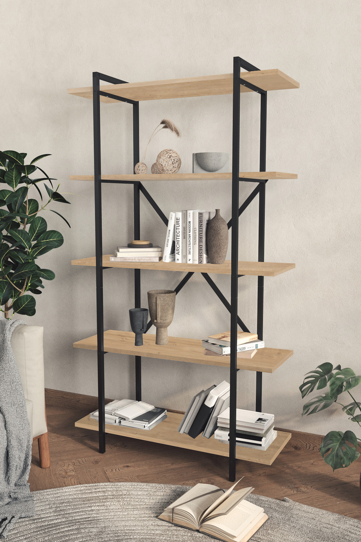 Knihovna NEVKA - dub safír Vneste do svého obývacího pokoje vkus a eleganci s praktickou loftovou knihovnou NEVKA. Svým moderním a elegantním industriálním stylem dokonale zapadne do každého interiéru. 5 prostorných polic a odolný kovový rám zajistí jak spoustu úložného prostoru navíc, tak dlouhotrvající používání po mnoho let. Na výběr ve třech nejpopulárnějších barevných provedeních - dub safír, bílá a antracit. PROVEDENÍ dodáváno v rozloženém stavu knihovna je vyrobena z 18mm dřevotřískové desky v souladu s 1. třídou evropských norem kvality E1 kovový rám knihovny je nalakován elektrostatickou práškovou barvou odolnou proti korozi a poškrábání snadné sestavení do několika minut přehledný návod v balení ROZMĚRY Šířka: 90 cm Hloubka: 30 cm Výška: 160 cm