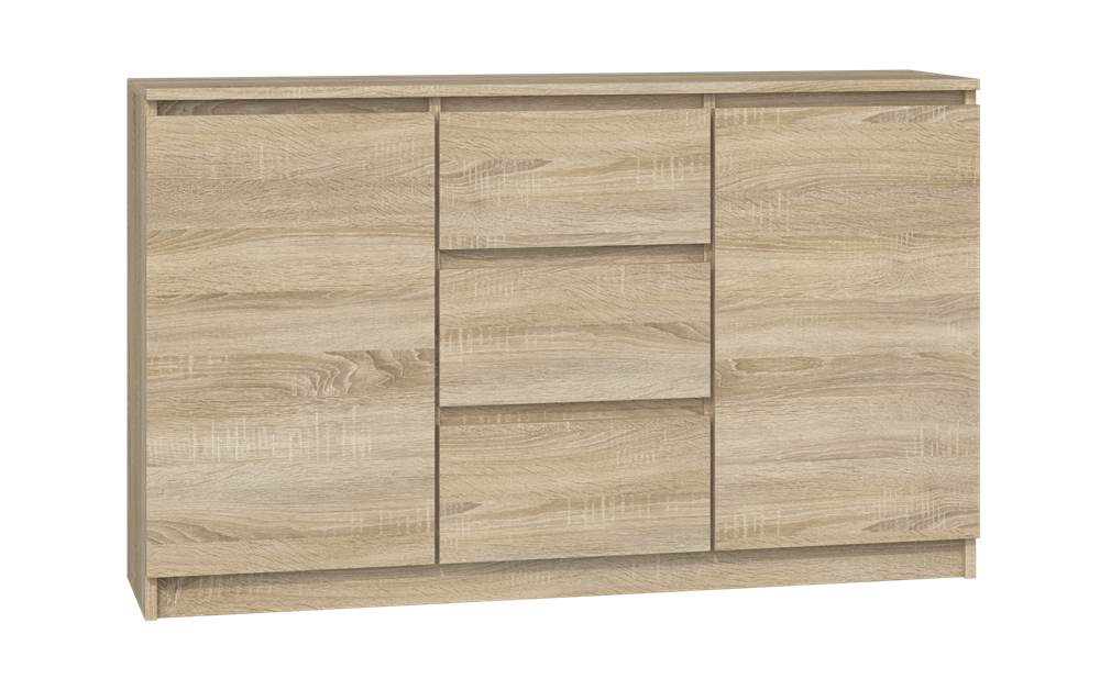 BARVA: DUB SONOMA Moderní komoda 2D3S je funkční a prostorný kus nábytku, který ozdobí interiér vaší ložnice, obývacího pokoje nebo dětského pokoje. Univerzální vzhled splní očekávání všech, kteří ocení kombinaci jednoduchosti a elegance. Vnitřek komody se skládá z polic a třech zásuvek, které vám pomohou věci uspořádat. Bude snazší najít to, co hledáte. Minimalistický design Čelní strany zásuvek a dveří bez rukojetí Zajišťují pohodlné používání a zdůrazňují modernistický charakter interiéru Počet dveří - 2 Počet šuplíků - 3 Velmi dobré zpracování Polský producent Návod k montáži v krabici. MATERIAL: Korpus - laminovaná dřevotříská 16mm. Hrany - zakončené PCV (vyznačuje se vysokou mechanickou a chemickou odolností) Zásuvky - na válečkových vedeních je to záruka pohodlného a především bezpečného používání. Dodatkově lze možno přikoupit Stůl PLUS. Rozměry : Hloubka: 40 cm Šířka: 120 cm Výška: 75 cm Očištění: Očistěte povrch nábytku měkkým hadříkem. Nepoužívejte agresivní chemikálie. V balení: Instrukce pro vlastní montáž. Dodávano v demontu.
