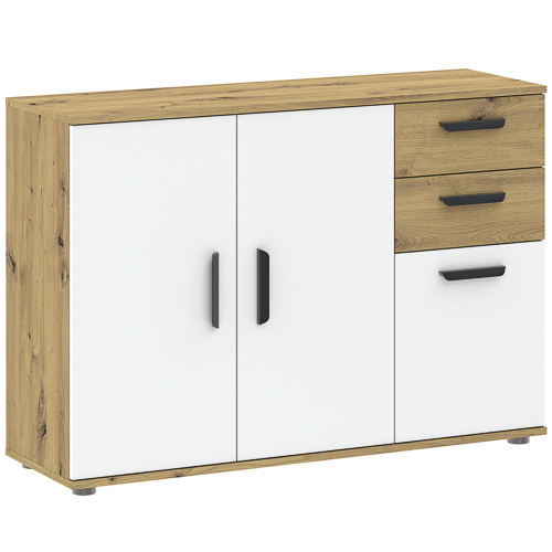 Představujeme nábytkovou sestavu BASIC TWO, která je ideální volbou pro ty, kteří hledají moderní a funkční řešení pro svůj domov. Kombinace čisté bílé barvy a dekoru dub artisan vytváří svěží a nadčasový design, který se hodí do každého interiéru. Sestava nabízí širokou škálu prvků, od prostorných šatních skříní, přes praktické komody, až po noční stolek a psací stůl, což vám umožní vybavit kompletní ložnici, dětský pokoj nebo pracovnu v jednotném stylu. Robustní konstrukce a kvalitní materiály zaručují dlouhou životnost a vysokou odolnost proti poškození. Díky promyšlené modularitě sestavy BASIC TWO si můžete sestavit nábytek přesně podle vašich představ a potřeb. Velké skříně s kombinací dveří a zásuvek nabízejí dostatek úložného prostoru pro oblečení i další věci. Komody s různým počtem zásuvek a dvířek poskytují praktické řešení pro organizaci drobnějších předmětů. Nezapomínáme ani na detaily – elegantní úchytky a decentní nožky dodávají nábytku moderní vzhled. Ať už zařizujete menší byt nebo prostorný dům, s nábytkovou sestavou BASIC TWO vytvoříte útulný a stylový domov. PROVEDENÍ čela z melaminových desek plastové úchytky plastové nožky PVC zakončení hran ROZMĚRY Šířka - 107 cm Výška - 75 cm Hloubka - 34 cm Rozměrová torelance +/- 3 cm.