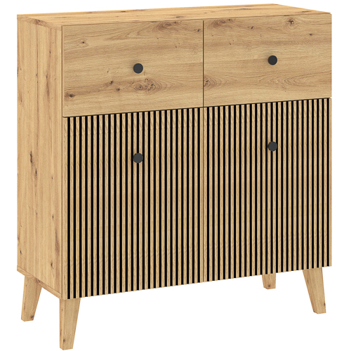 Nábytková sestava BERLIN je inspirována současným skandinávským designem, který kombinuje jednoduché linie, přírodní textury a funkčnost. Hlavním poznávacím znakem této kolekce je zajímavá kombinace dekoru dřeva v odstínu dubu artisan s originálními lamelami v elegantní černé barvě, které dodávají nábytku moderní a vzdušný vzhled. Tato stylová série nabízí širokou škálu prvků, od komod různých velikostí, přes TV stolky, vitríny, konferenční a noční stolky. Všechny kusy stojí na kónických nožkách z masivu, které celkovou estetiku ještě více umocňují a usnadňují úklid pod nábytkem. Díky těmto prvkům se kolekce BERLIN stane dominantou každého moderního interiéru. Kolekce BERLIN není jen o kráse, ale také o praktičnosti. Skříňky a zásuvky poskytují dostatek úložného prostoru pro vaše věci, zatímco vitrína s prosklenou částí umožňuje vystavit oblíbené dekorace. Kvalitní materiály zaručují dlouhou životnost a snadnou údržbu. Ať už zařizujete obývací pokoj, ložnici nebo předsíň, nábytek BERLIN vám pomůže vytvořit útulné a harmonické prostředí. Sestavte si z jednotlivých prvků kombinaci na míru vašim potřebám a užívejte si minimalistickou eleganci, která nikdy nevyjde z módy. PROVEDENÍ čela z MDF desek plastové úchyty dřevěné nožky PVC zakončení hran ROZMĚRY Šířka - 92 cm Výška - 96 cm Hloubka - 42 cm Rozměrová torelance +/- 3 cm.