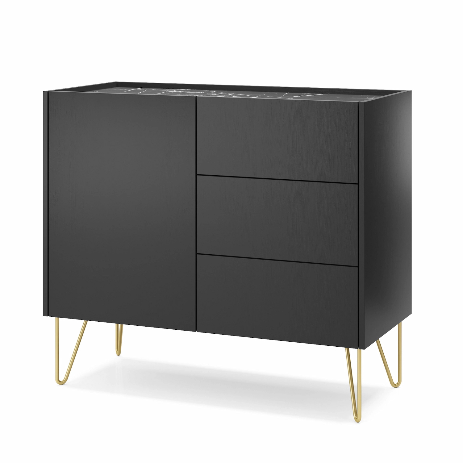 Elegantní kombinace černé a zlaté pro moderní interiér Nábytková sestava HARMONY přináší do vašeho obývacího pokoje sofistikovaný design s nádechem luxusu. Tmavá, téměř černá povrchová úprava s jemnou strukturou dřeva je elegantně doplněna lesklými zlatými nožičkami ve tvaru vlásenek, které dodávají nábytku lehkost a moderní styl. Tento kontrast barev a materiálů vytváří poutavý celek, který se stane dominantou každého prostoru. Funkčnost a styl s mramorovým akcentem Sestava HARMONY není jen o kráse, ale i o praktičnosti. Promyšlené úložné prostory v podobě komod a skříněk zajistí pořádek ve vašem domově, zatímco odolná deska s imitací černého mramoru na konferenčním stolku a vrchních plochách dodává sestavě exkluzivní vzhled a zároveň je snadno udržovatelná. HARMONY je ideální volbou pro ty, kteří hledají harmonické spojení moderního designu, vysoké funkčnosti a nadčasové elegance. PROVEDENÍ Oboustranně laminovaná deska tloušťky 16 mm Hrany dodatečně zakončené ABS dýhou MDF deska Pevné kovové nožky Bezúchytový systém push-to-open Odolná a pevná konstrukce Nábytek pro svépomocnou montáž, dodáván v rozloženém stavu s návodem ROZMĚRY Šířka - 97 cm Výška - 83 cm Hloubka - 37 cm Rozměrová tolerance +/- 3 cm.