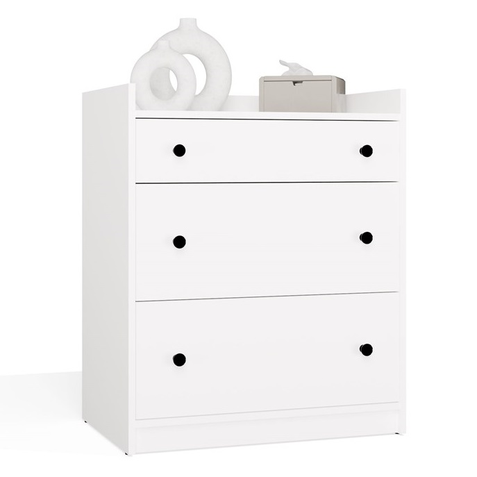 Komoda HOUSTON je univerzální kus nábytku, který se bude perfektně hodit do dětského pokoje, ložnice, obývacího pokoje nebo chodby. Díky svému minimalistickému, ale elegantnímu tvaru se hodí do mnoha stylů interiérového designu – od moderního až po klasický. Díky 3 prostorným zásuvkám s pohodlnými úchyty poskytuje dostatek prostoru pro uložení oblečení, doplňků, textilií nebo dětských věcí. Zvýšené boky horní části vytvářejí praktické hrany, které zabraňují sklouznutí drobných předmětů – ideální pro umístění přebalovacího pultu, lampy nebo organizérů. PROVEDENÍ 3 hluboké a funkční zásuvky na kolečkových vedeních Zvýšená horní část s okraji Matné, praktické, kulaté rukojeti v černé barvě - kov Jednoduchý a estetický design Kompaktní tvar - ideální do menších prostor Korpus a čela: laminovaná deska o tloušťce 16 mm ROZMĚRY Šířka - 70 cm Hloubka - 46 cm Celková výška - 84 cm ROZMĚRY ZÁSUVKY (vnitřní) Šířka - 61 cm Hloubka - 38 cm Výška čela Horní zásuvka - 14,5 cm Prostřední a spodní zásuvka - 26,5 cm Rozměrová tolerance +/- 3 cm.