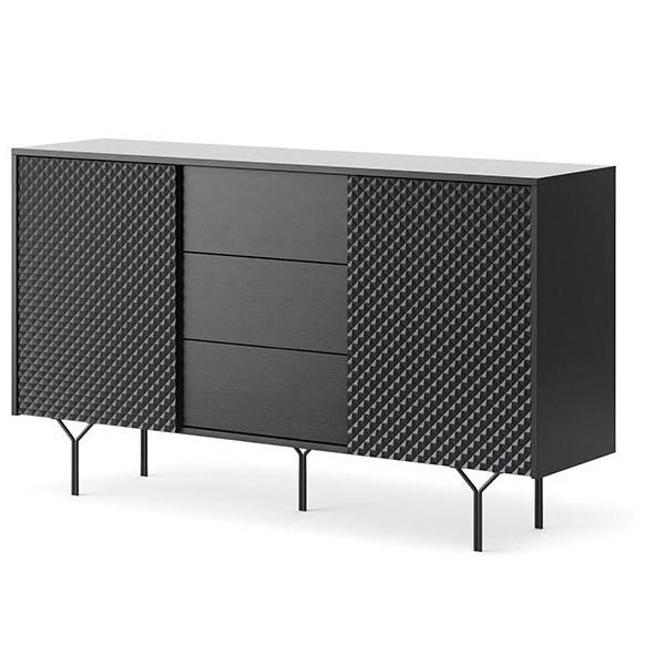 Objevte obývací sestavu RAVEN, která přinese do vašeho interiéru moderní eleganci a funkčnost. Tato sestava v temně grafitovém odstínu se pyšní unikátním 3D geometrickým vzorem na dvířkách, který poutá pozornost a dodává nábytku sofistikovaný vzhled. Kovové nožky se zajímavým Y-tvarem u některých prvků podtrhují industriální nádech a zároveň zajišťují stabilitu. Sestava RAVEN je navržena pro praktické uspořádání vašeho obývacího pokoje, nabízí dostatek úložného prostoru ve formě komod a RTV stolku, které se ideálně hodí pro uložení multimédií i osobních věcí. Kombinace hladkých povrchů s výraznou texturou vytváří dynamický celek, který se snadno začlení do moderních i minimalisticky zařízených prostor a dodá jim osobitý charakter. PROVEDENÍ Vysoce kvalitní laminovaná dřevotřísková deska Hrany dodatečně zakončené ABS dýhou MDF deska Pevné kovové černé nožky Bezúchytkový systém push-to-open Odolná a pevná konstrukce Nábytek pro svépomocnou montáž, dodáván v rozloženém stavu s návodem ROZMĚRY Šířka - 144 cm Výška - 83 cm Hloubka - 38 cm Rozměrová tolerance +/- 3 cm.