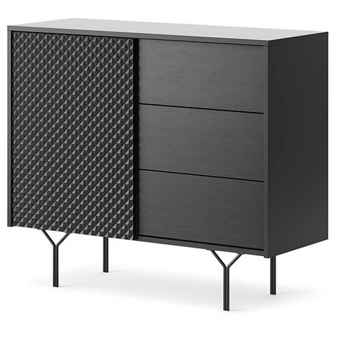 Objevte obývací sestavu RAVEN, která přinese do vašeho interiéru moderní eleganci a funkčnost. Tato sestava v temně grafitovém odstínu se pyšní unikátním 3D geometrickým vzorem na dvířkách, který poutá pozornost a dodává nábytku sofistikovaný vzhled. Kovové nožky se zajímavým Y-tvarem u některých prvků podtrhují industriální nádech a zároveň zajišťují stabilitu. Sestava RAVEN je navržena pro praktické uspořádání vašeho obývacího pokoje, nabízí dostatek úložného prostoru ve formě komod a RTV stolku, které se ideálně hodí pro uložení multimédií i osobních věcí. Kombinace hladkých povrchů s výraznou texturou vytváří dynamický celek, který se snadno začlení do moderních i minimalisticky zařízených prostor a dodá jim osobitý charakter. PROVEDENÍ Vysoce kvalitní laminovaná dřevotřísková deska Hrany dodatečně zakončené ABS dýhou MDF deska Pevné kovové černé nožky Bezúchytkový systém push-to-open Odolná a pevná konstrukce Nábytek pro svépomocnou montáž, dodáván v rozloženém stavu s návodem ROZMĚRY Šířka - 97 cm Výška - 83 cm Hloubka - 38 cm Rozměrová tolerance +/- 3 cm.