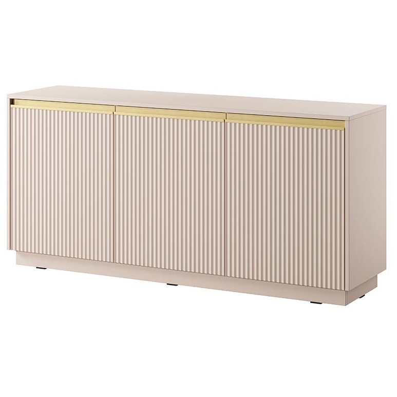 Nábytková sestava ROYAL – Elegance a moderní design pro váš domov Objevte nábytkovou sestavu ROYAL, která přináší do vašeho interiéru kombinaci elegance a moderního designu. Tato unikátní kolekce je charakteristická svým rýhovaným dekorem na čelních plochách, který dodává nábytku sofistikovaný vzhled a zajímavou texturu. Zlaté horizontální úchyty diskrétně doplňují celkový design a podtrhují jeho exkluzivitu. Sestava ROYAL je navržena tak, aby dokonale ladila s různými styly bydlení a stala se dominantou každého obývacího pokoje. Dostupnost a variabilita Nábytková sestava ROYAL je dostupná ve třech elegantních barevných variantách: nadčasové bílé elegantní černé jemné béžové. Díky této široké škále barev si můžete vybrat tu, která nejlépe doplní váš stávající interiér a osobní styl. Ať už preferujete světlé a vzdušné prostory, nebo dáváte přednost výraznějším tónům, ROYAL vám umožní vytvořit harmonický a funkční domov. Sestava nabízí dostatek úložného prostoru a promyšlené řešení pro moderní bydlení. PROVEDENÍ Vysoce kvalitní laminovaná dřevotřísková deska Hrany dodatečně zakončené ABS dýhou MDF deska Pevné a stabilní kovové nožky Bezúchytkový systém otevírání Odolná a pevná konstrukce Nábytek pro svépomocnou montáž, dodáván v rozloženém stavu s návodem ROZMĚRY Šířka - 154 cm Výška - 72 cm Hloubka - 39 cm Rozměrová tolerance +/- 3 cm.