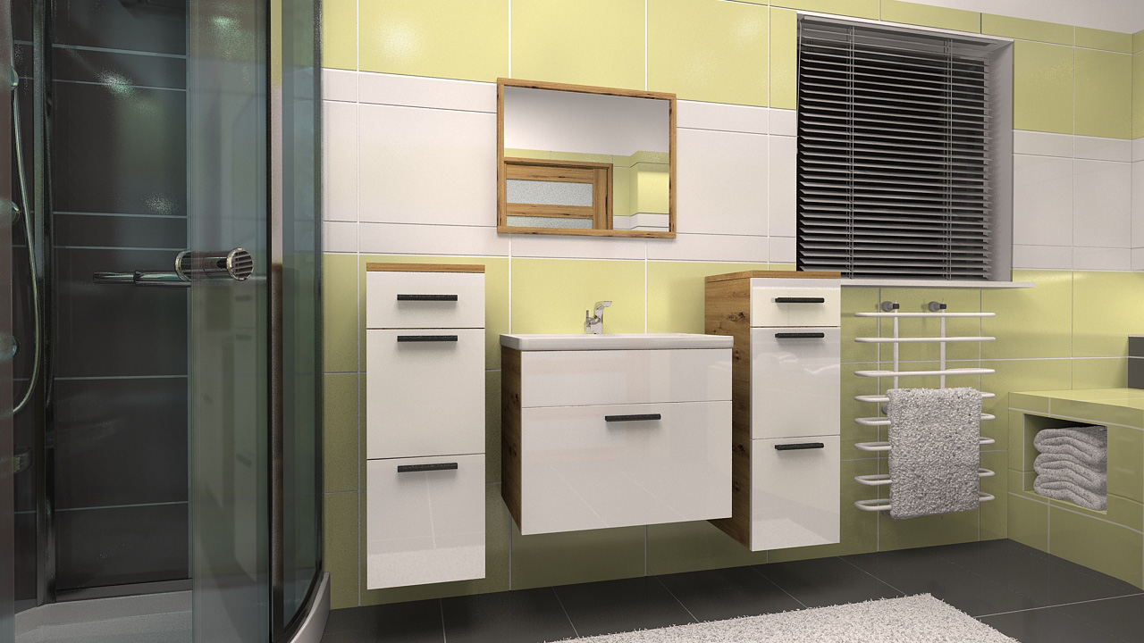ROZMĚRY SKŘÍNĚ: (šířka/výška/hloubka [cm]) W14 [zrcadlo] 60/50/2 W13 [pod umyvadlem] 60/47/31 W12 [střední skříň] 30/84/30 W12 [střední skříň] 30/84/30 UMYVADLO - 60/10/35