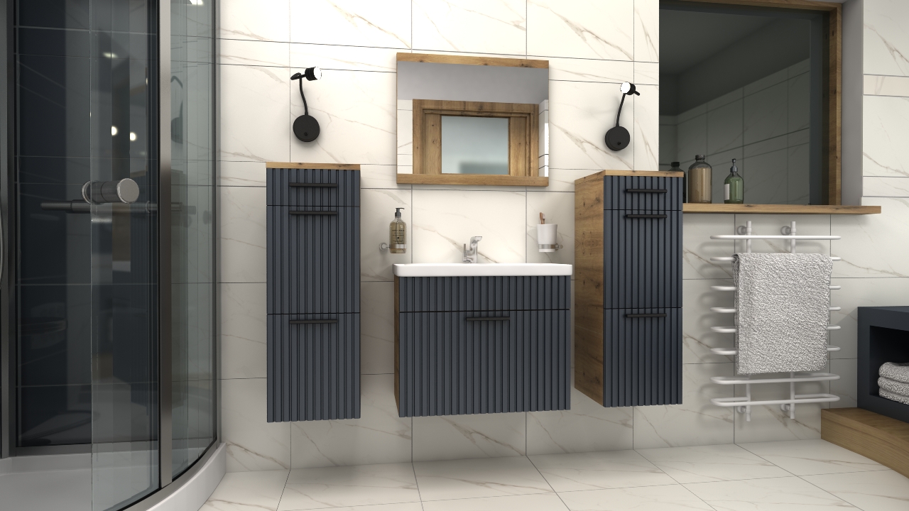 ROZMĚRY SKŘÍNÍ (šířka / výška / hloubka [cm]): T14 [zrcadlo] 60/50/2 T13 [pod umyvadlo] 60/47/31 T12 [střední skříň] 30/84/30 T12 [střední skříň] 30/84/30 UMYVADLO - 60/10/35