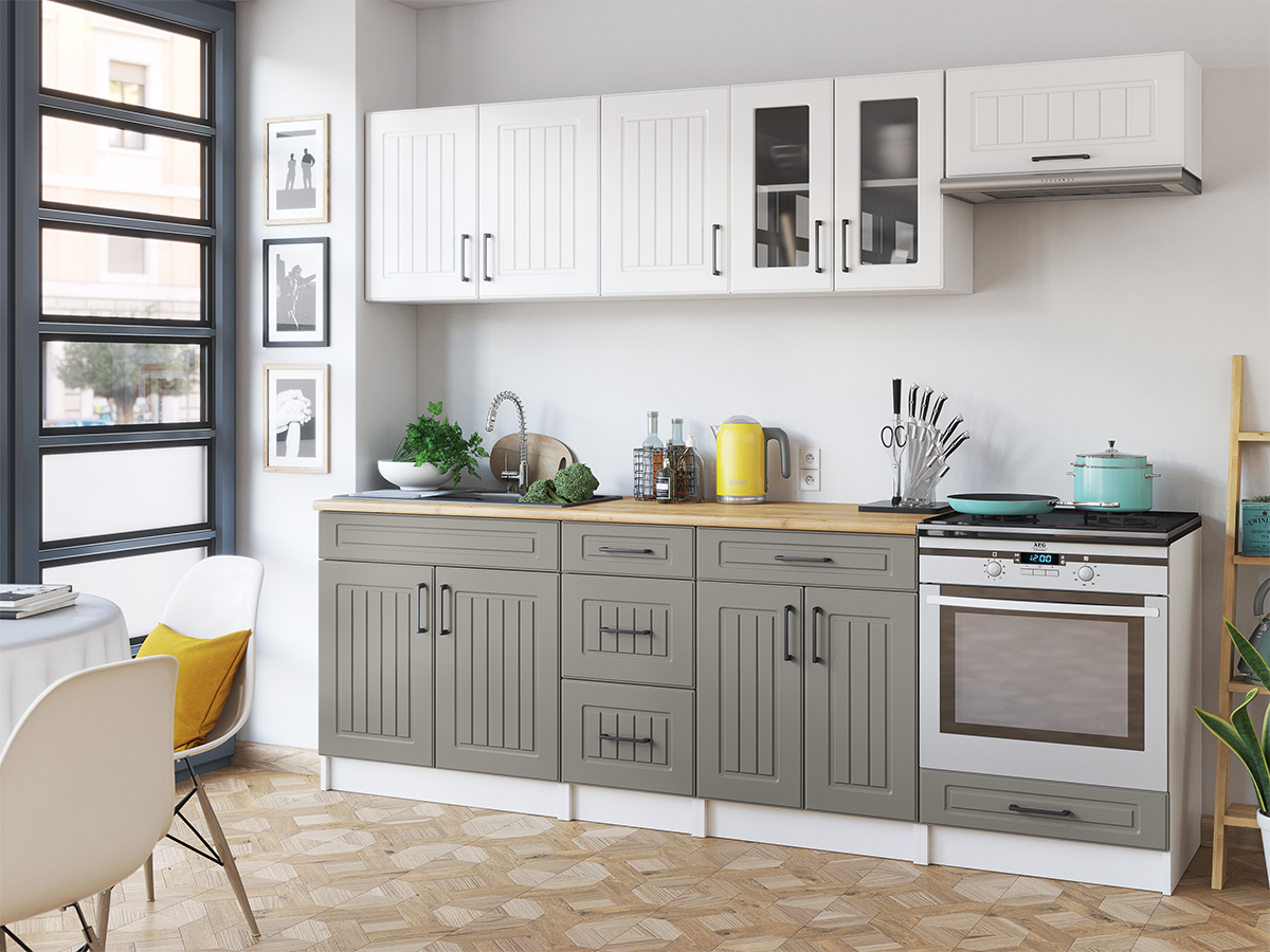 ROZMĚRY: Skříňky spodní šířka: 240 cm Skříňky horní šířka: 240 cm Výška skříňěk dolních: 86 cm (2,8 cm pracovní deska/ 10 cm sokl) Výška skříňěk horních: 58 cm Hloubka skříněk horních: 30 cm Hloubka skříňěk dolních: 45 cm Hloubka pracovní desky: 60 cm