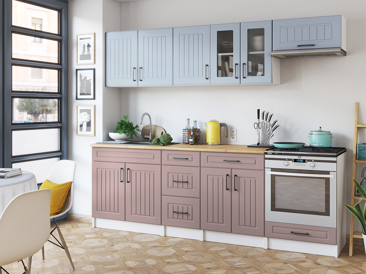 ROZMĚRY: Skříňky spodní šířka: 240 cm Skříňky horní šířka: 240 cm Výška skříňěk dolních: 86 cm (2,8 cm pracovní deska/ 10 cm sokl) Výška skříňěk horních: 58 cm Hloubka skříněk horních: 30 cm Hloubka skříňěk dolních: 45 cm Hloubka pracovní desky: 60 cm