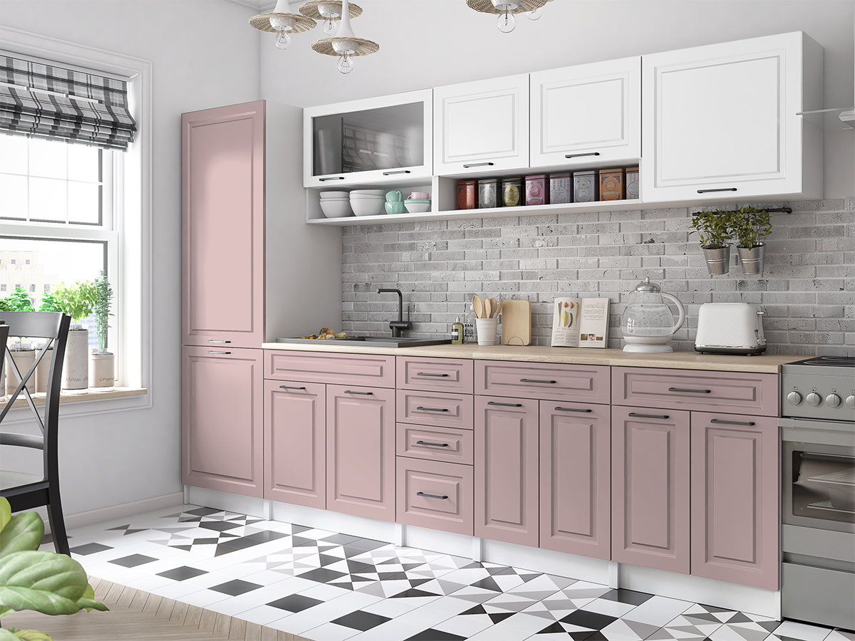 ROZMĚRY: Šířka spodních skříněk: 300 cm Šířka horních skříněk: 240 cm Výška spodních skříněk: 86 cm (2,8 cm pracovní deska / 10 cm sokl) Výška horních skříněk: 58 cm Hloubka horních skříněk: 30 cm Hloubka spodních skříněk: 45 cm Hloubka pracovní desky: 60 cm