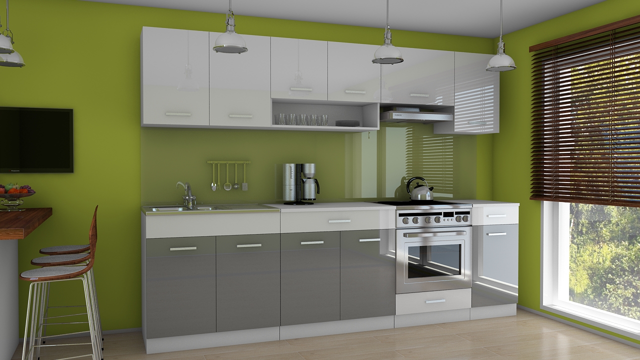 ROZMĚRY: Šířka spodních skříněk: 260 cm Šířka horních skříněk: 260 cm Výška spodních skříněk: 86 cm ( 2,8 cm pracovní deska / sokl 10 cm) Výška horních skříněk: 58 cm Hloubka horních skříněk: 30 cm Hloubka spodních skříněk: 45 cm Hloubka pracovní desky: 60 cm