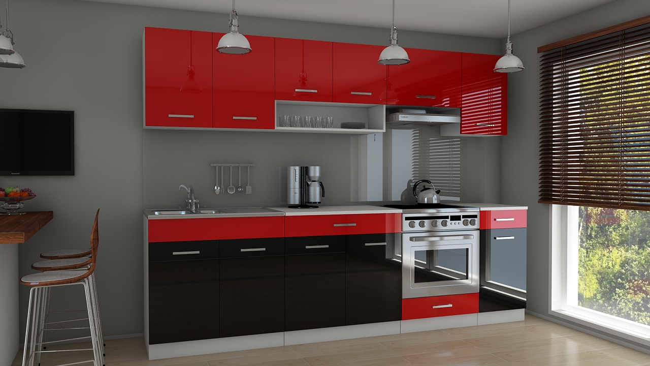 ROZMĚRY: Šířka spodních skříněk: 260 cm Šířka horních skříněk: 260 cm Výška spodních skříněk: 86 cm ( 2,8 cm pracovní deska / sokl 10 cm) Výška horních skříněk: 58 cm Hloubka horních skříněk: 30 cm Hloubka spodních skříněk: 45 cm Hloubka pracovní desky: 60 cm