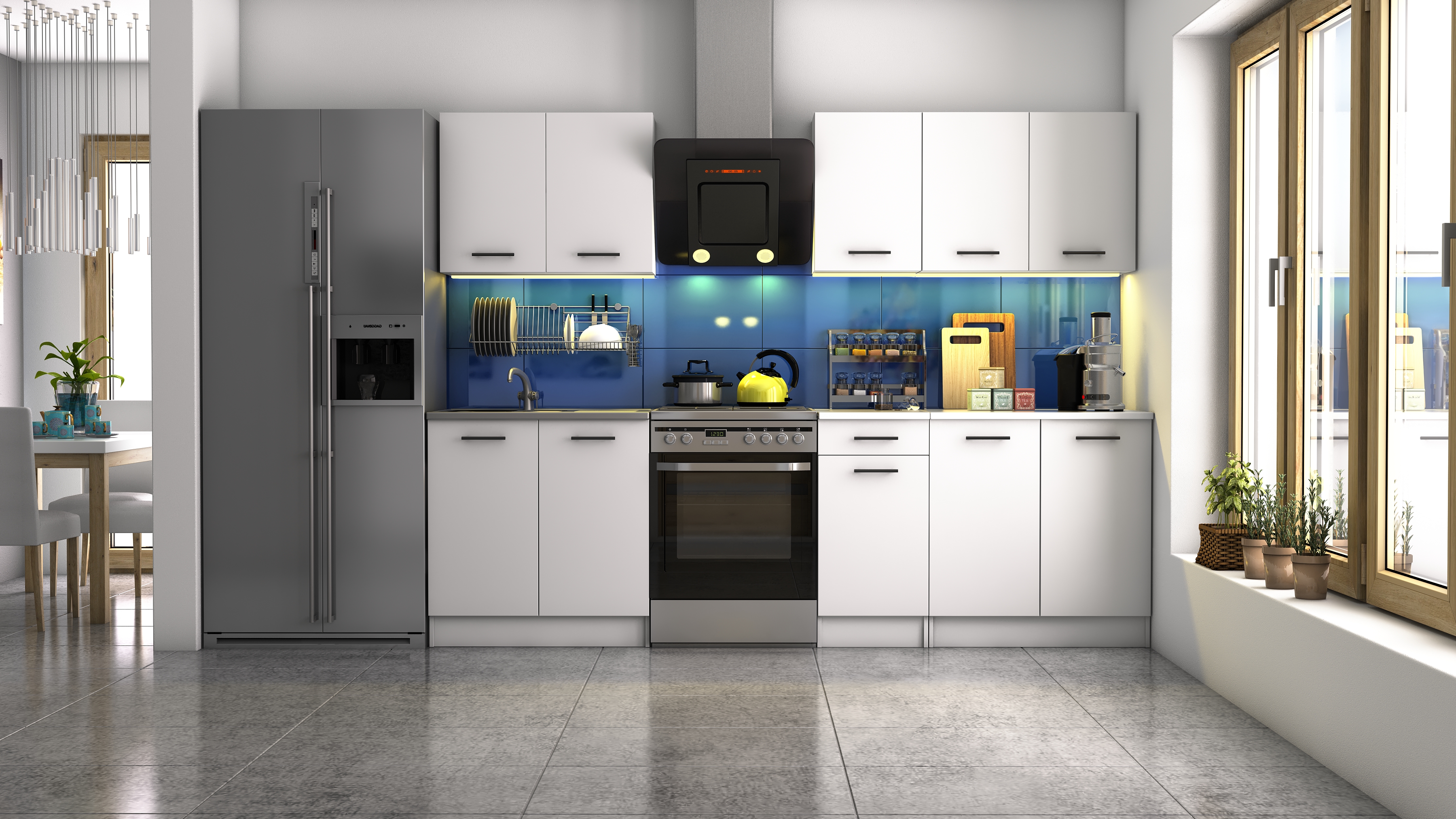 ROZMĚRY: Šířka spodních skříněk: 200 cm Šířka horních skříněk: 200 cm Výška spodních skříněk: 86 cm (2,8 cm pracovní deska / 10 cm sokl) Výška horních skříněk: 58 cm Celková výška spodní skříňky bez pracovní desky: 83 cm Hloubka horních skříněk: 30 cm Hloubka spodních skříněk: 45 cm Hloubka pracovní desky: 60 cm