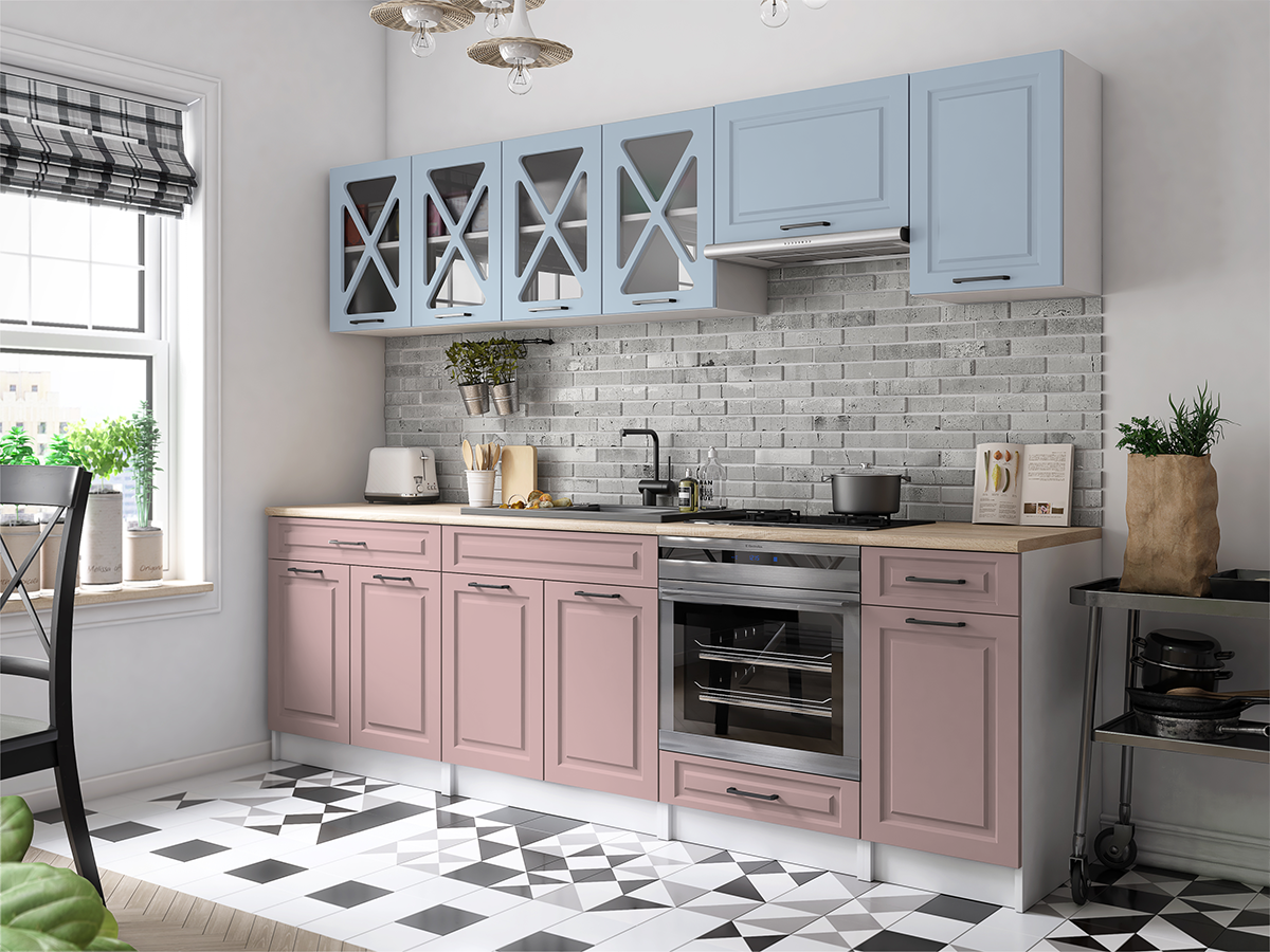ROZMĚRY: Šířka spodních skříněk: 260 cm Šířka horních skříněk: 260 cm Výška spodních skříněk: 86 cm (2,8 cm pracovní deska / 10 cm sokl) Výška horních skříněk: 58 cm Hloubka horních skříněk: 30 cm Hloubka spodních skříněk: 45 cm Hloubka pracovní desky: 60 cm