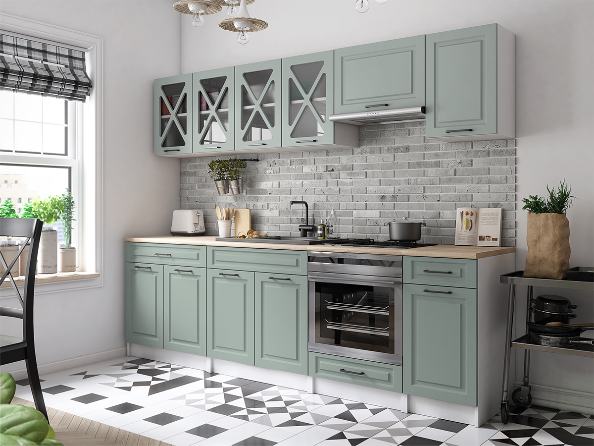 ROZMĚRY: Šířka spodních skříněk: 260 cm Šířka horních skříněk: 260 cm Výška spodních skříněk: 86 cm (2,8 cm pracovní deska / 10 cm sokl) Výška horních skříněk: 58 cm Hloubka horních skříněk: 30 cm Hloubka spodních skříněk: 45 cm Hloubka pracovní desky: 60 cm