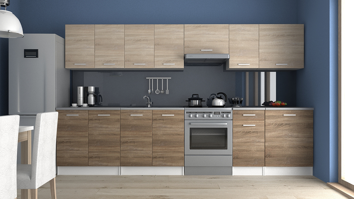 ROZMĚRY: Šířka spodních skříněk: 260 cm Šířka horních skříněk: 320 cm Výška spodních skříněk: 86 cm (2,8 cm pracovní deska / 10 cm sokl) Výška horních skříněk: 58 cm Hloubka horních skříněk: 30 cm Hloubka spodních skříněk: 45 cm Hloubka pracovní desky: 60 cm
