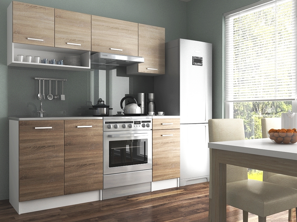 ROZMĚRY: Šířka spodních skříněk: 120 cm Šířka horních skříněk: 180 cm Výška spodních skříněk: 86 cm (2,8 cm pracovní deska / 10 cm sokl) Výška horních skříněk: 58 cm Celková výška spodní skříňky bez pracovní desky: 83 cm Hloubka horních skříněk: 30 cm Hloubka spodních skříněk: 45 cm Hloubka pracovní desky: 60 cm