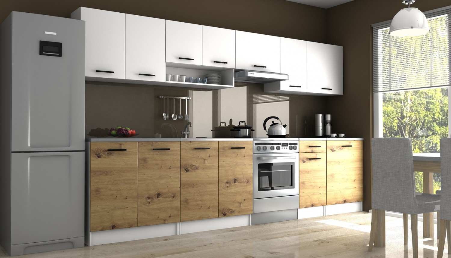 ROZMĚRY: Šířka spodních skříněk: 260 cm Šířka horních skříněk: 320 cm Výška spodních skříněk: 86 cm (2,8 cm pracovní deska / 10 cm sokl) Výška horních skříněk: 58 cm Hloubka horních skříněk: 30 cm Hloubka spodních skříněk: 45 cm Hloubka pracovní desky: 60 cm