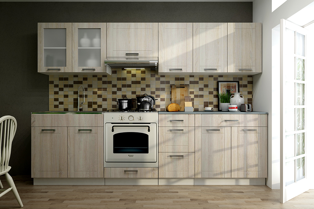 ROZMĚRY: Šířka spodních skříněk: 260 cm Šířka horních skříněk: 260 cm Výška spodních skříněk: 86 cm (2,8 cm pracovní deska / 10 cm sokl) Výška horních skříněk: 58 cm Hloubka horních skříněk: 30 cm Hloubka spodních skříněk: 45 cm Hloubka pracovní desky 60 cm