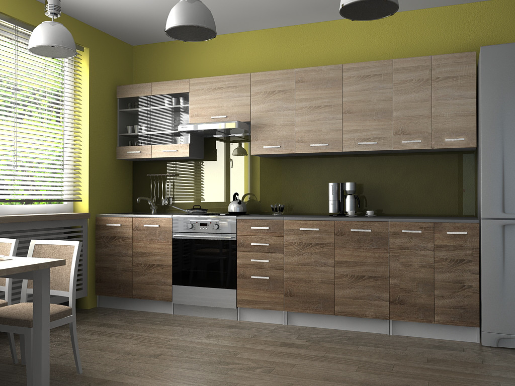 ROZMĚRY: Šířka spodních skříněk: 260 cm Šířka horních skříněk: 320 cm Výška spodních skříněk - 86 cm (2,8 cm pracovní deska / 10 cm sokl) Výška horních skříněk: 72 cm Hloubka horních skříněk: 30 cm Hloubka spodních skříněk: 45 cm Hloubka pracovní desky: 60 cm