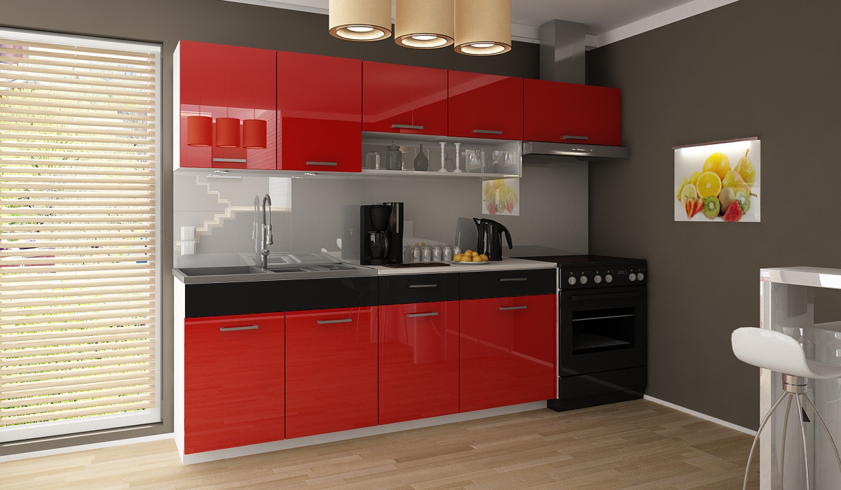 ROZMĚRY: Šířka spodních skříněk: 180 cm Šířka horních skříněk: 240 cm Výška spodních skříněk: 86 cm (2,8 cm pracovní deska / 10 cm sokl) Výška horních skříněk: 58 cm Výška okapové skříně: 40 cm Hloubka horních skříněk: 30 cm Hloubka spodních skříněk: 45 cm Hloubka skříně trouby: 56 cm Hloubka pracovní desky: 60 cm