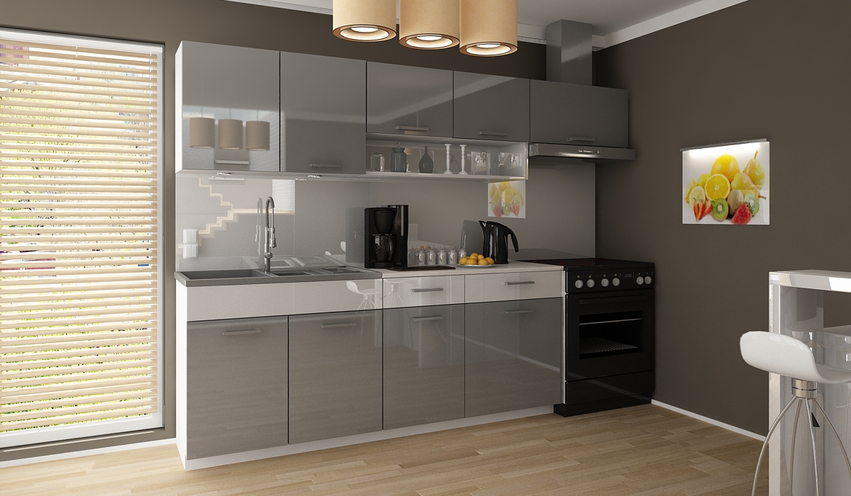 ROZMĚRY: Šířka spodních skříněk: 180 cm Šířka horních skříněk: 240 cm Výška spodních skříněk: 86 cm (2,8 cm pracovní deska / 10 cm sokl) Výška horních skříněk: 58 cm Výška okapové skříně: 40 cm Hloubka horních skříněk: 30 cm Hloubka spodních skříněk: 45 cm Hloubka skříně trouby: 56 cm Hloubka pracovní desky: 60 cm