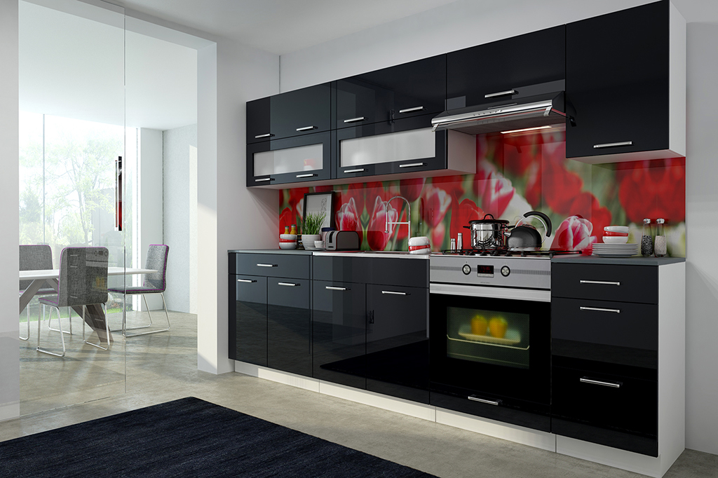 ROZMĚRY: Šířka spodních skříněk: 260 cm Šířka horních skříněk: 260 cm Výška spodních skříněk: 86 cm (2,8 cm pracovní deska / 10 cm sokl) Výška horních skříněk: 58 cm Výška digestořové skříně: 40 cm Hloubka horních skříněk: 30 cm Hloubka spodních skříněk: 45 cm Hloubka skříně trouby: 56 cm Hloubka pracovní desky: 60 cm