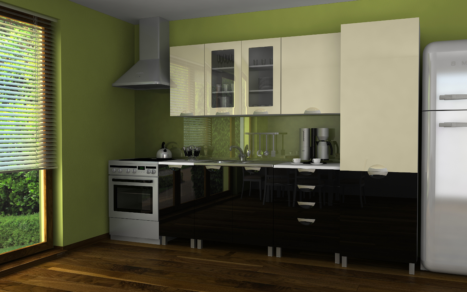 ROZMĚRY: Šířka spodních skříněk: 240 cm Výška spodních skříněk: 86 cm (2,8 cm pracovní deska / 10 cm nohy) Hloubka spodních skříněk: 50 cm Hloubka pracovní desky: 60 cm Šířka horních skříněk: 240 cm Výška horních skříněk: 72 cm hloubka horních skříněk: 30 cm