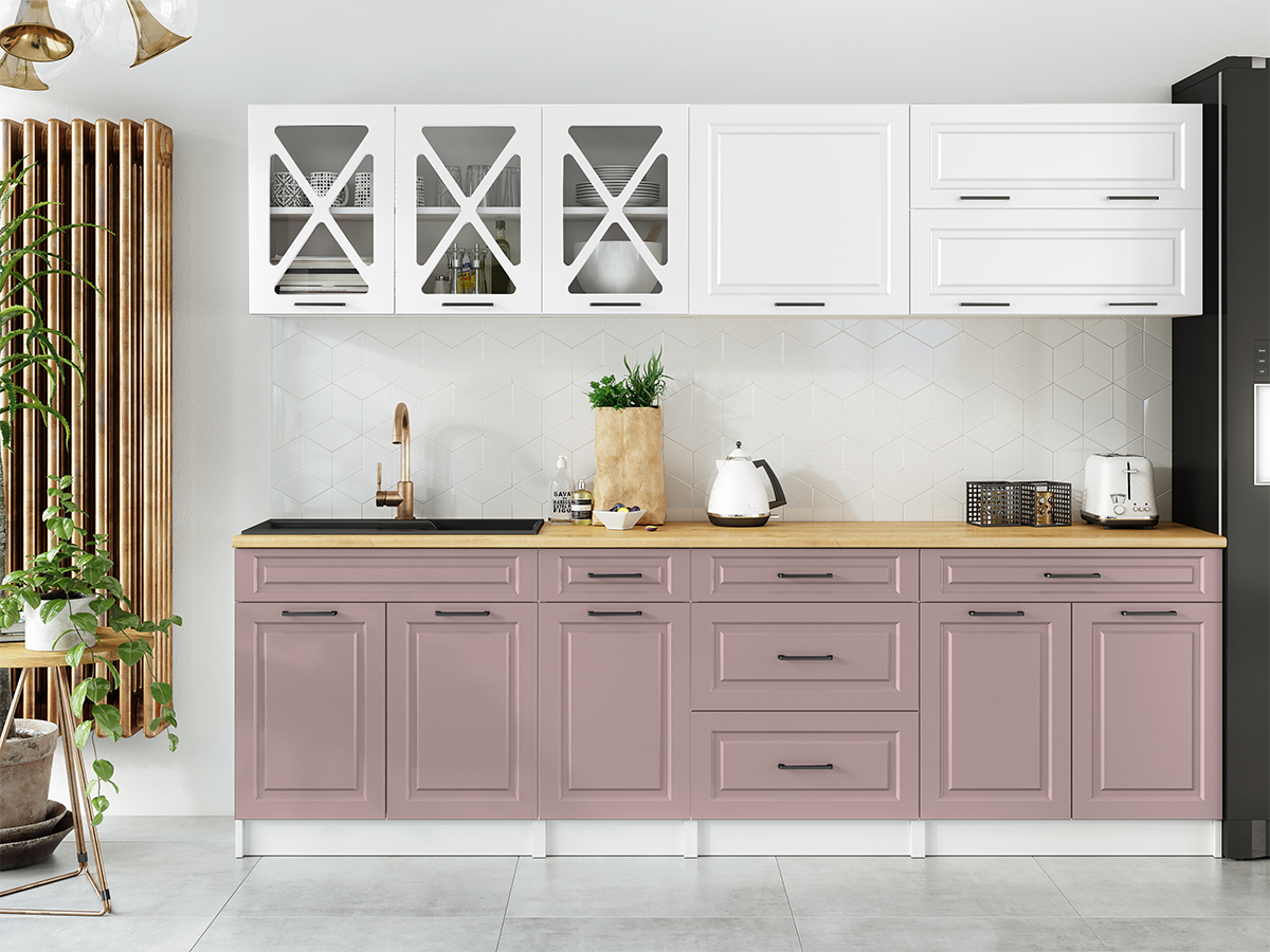 ROZMĚRY: Šířka spodních skříněk: 260 cm Šířka horních skříněk: 260 cm Výška spodních skříněk: 86 cm (2,8 cm pracovní deska / 10 cm sokl) Výška horních skříněk: 58 cm Hloubka horních skříněk: 30 cm Hloubka spodních skříněk: 45 cm Hloubka pracovní desky: 60 cm