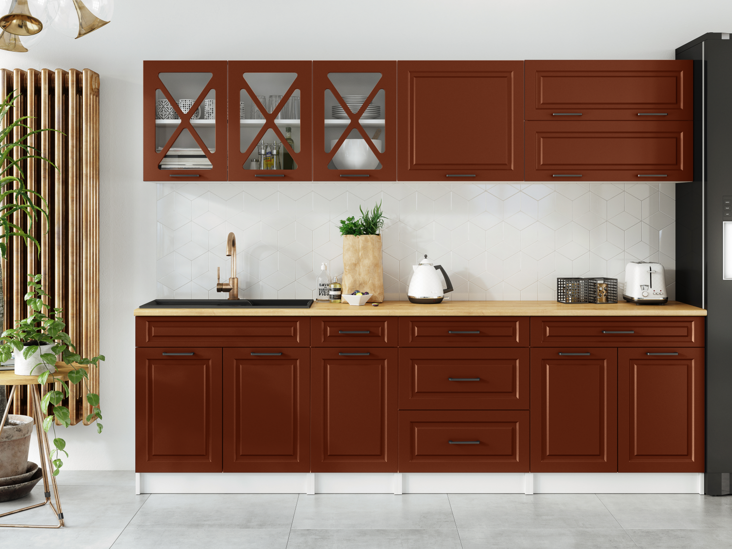 ROZMĚRY: Šířka spodních skříněk: 260 cm Šířka horních skříněk: 260 cm Výška spodních skříněk: 86 cm (2,8 cm pracovní deska / 10 cm sokl) Výška horních skříněk: 58 cm Hloubka horních skříněk: 30 cm Hloubka spodních skříněk: 45 cm Hloubka pracovní desky: 60 cm