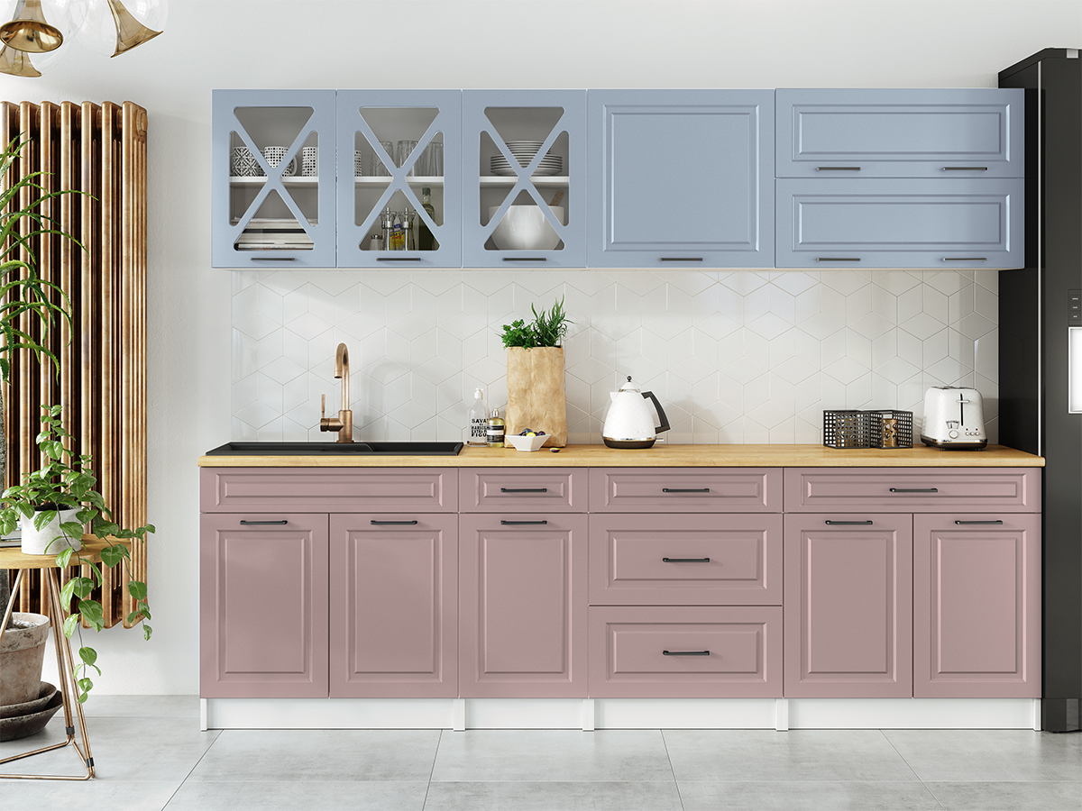 ROZMĚRY: Šířka spodních skříněk: 260 cm Šířka horních skříněk: 260 cm Výška spodních skříněk: 86 cm (2,8 cm pracovní deska / 10 cm sokl) Výška horních skříněk: 58 cm Hloubka horních skříněk: 30 cm Hloubka spodních skříněk: 45 cm Hloubka pracovní desky: 60 cm