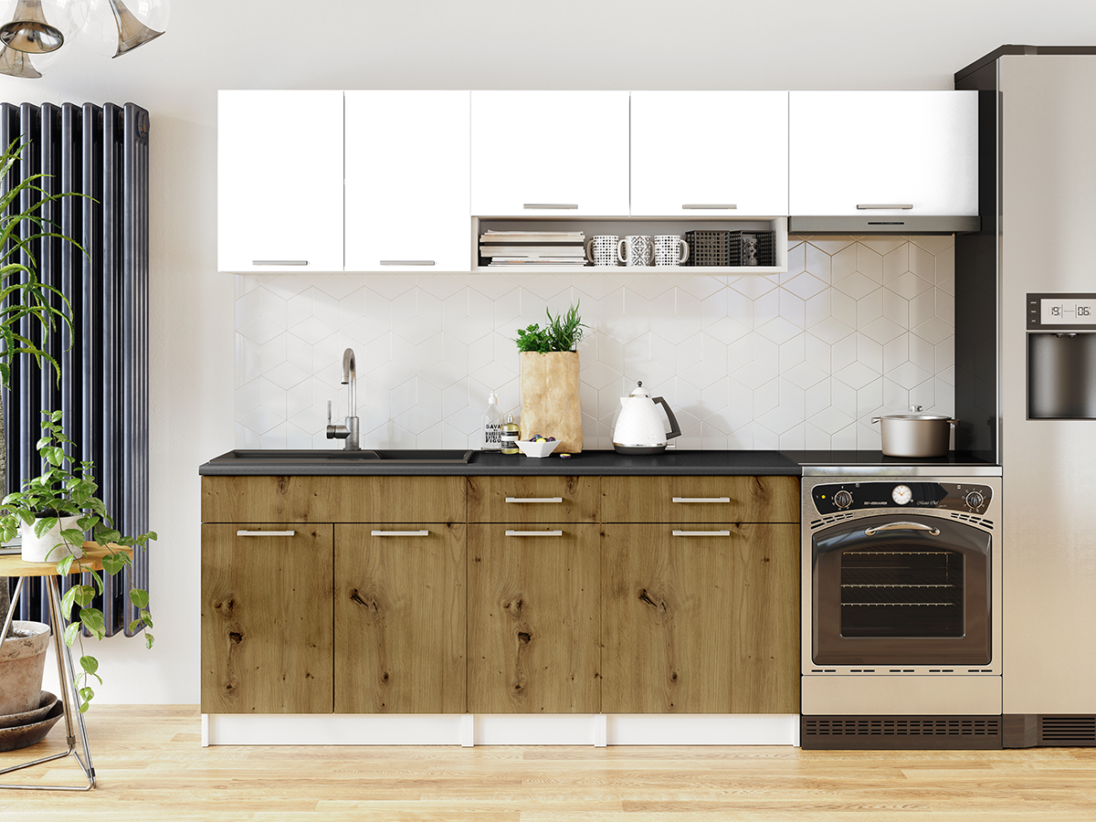 ROZMĚRY: Šířka spodních skříněk: 180 cm Šířka horních skříněk: 240 cm Výška spodních skříněk: 86 cm (2,8 cm pracovní deska / 10 cm sokl) Výška horních skříněk: 58 cm Výška okapové skříně: 40 cm Hloubka horních skříněk: 30 cm Hloubka spodních skříněk: 45 cm Hloubka skříně trouby: 56 cm Hloubka pracovní desky: 60 cm