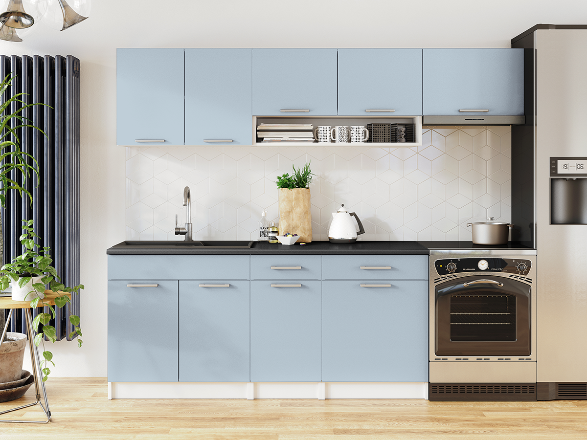 ROZMĚRY: Šířka spodních skříněk: 180 cm Šířka horních skříněk: 240 cm Výška spodních skříněk: 86 cm (2,8 cm pracovní deska / 10 cm sokl) Výška horních skříněk: 58 cm Výška okapové skříně: 40 cm Hloubka horních skříněk: 30 cm Hloubka spodních skříněk: 45 cm Hloubka skříně trouby: 56 cm Hloubka pracovní desky: 60 cm