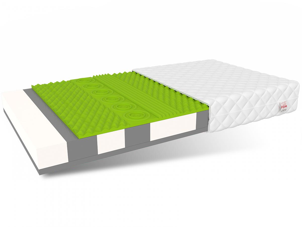 Specifikace: tvrdost: H2 středně měkká H3 středně tvrdý tloušťka: 11 cm Složení: HR pěna: 6 cm polyuretanová pěna T25: 2 cm obal: 1 cm vysoce pružná profilovaná pěna R44: 2 cm.