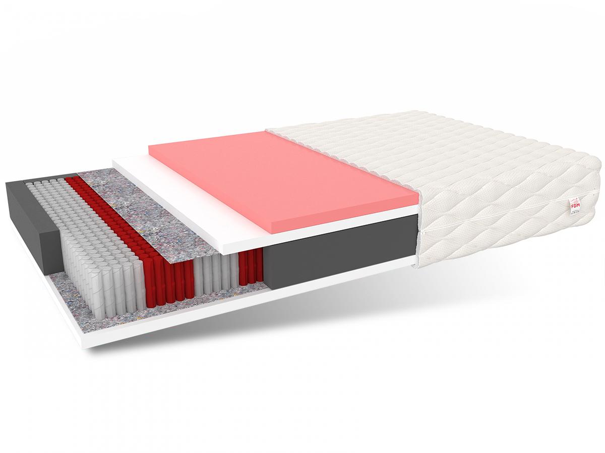 Specifikace: tvrdost: H4 tvrdá H3 středně tvrdý, tloušťka: 19 cm. Složení: polyuretanová pěna T25: 2 cm termoplastická pěna VISCO: 2 cm obal: 1 cm, výška pružiny: 12 cm polyuretanová pěna T25: 2 cm.