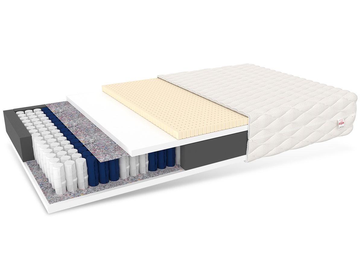 Specifikace: tvrdost: H3 středně tvrdá tloušťka: 19 cm Složení: Perforovaný latex: 2 cm polyuretanová pěna T25: 2 cm obal: 1 cm výška pružiny: 12 cm polyuretanová pěna T25: 2 cm
