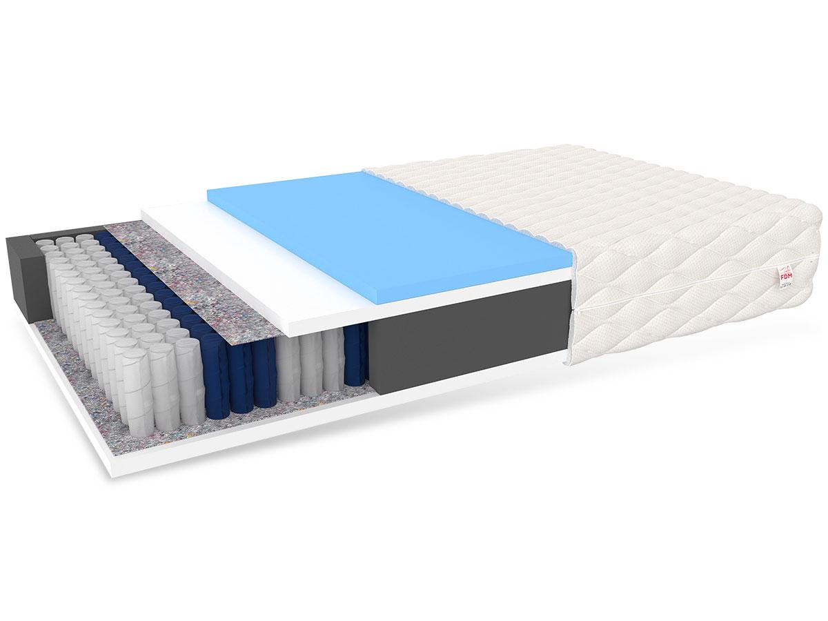 Specifikace: tvrdost: H2 středně měkká tloušťka: 25 cm Složení: polyuretanová pěna T25: 2 cm obal: 1 cm výška pružiny: 18 cm polyuretanová pěna T25: 2 cm vysoce odolná pěna: 2 cm