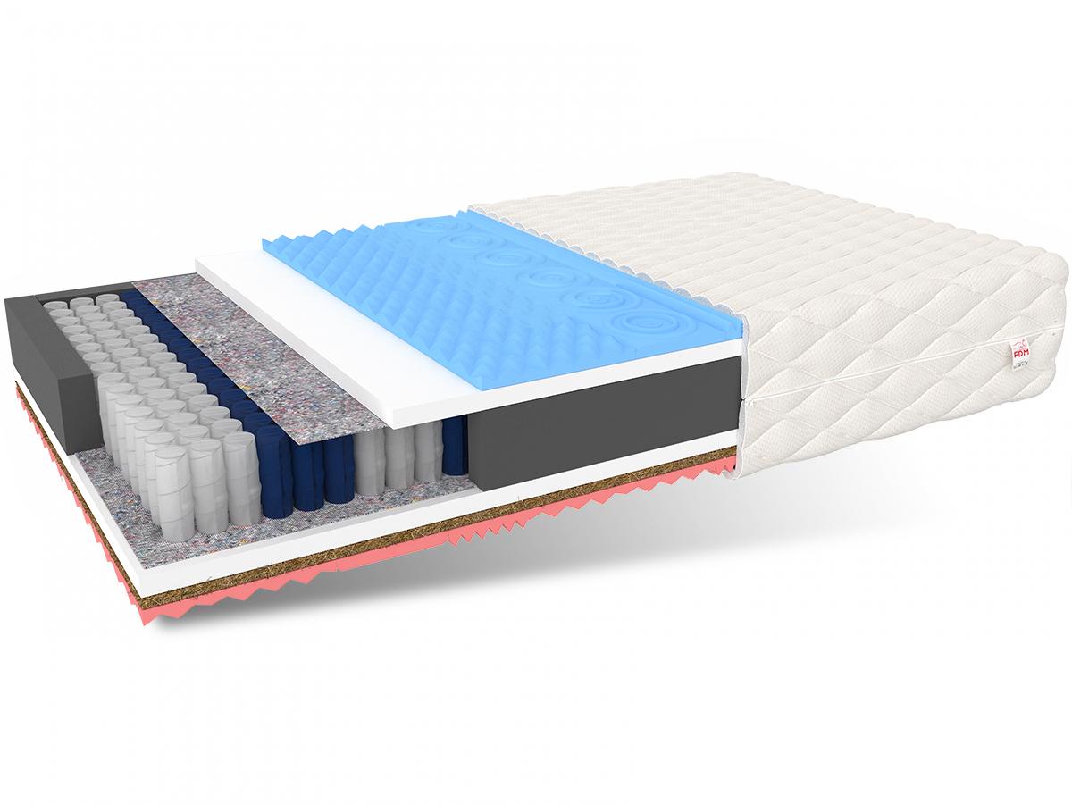 Specifikace tvrdost: H4 tvrdá H3 středně tvrdý tloušťka: 22 cm Složení: Kokosová vložka: 1 cm profilovaná pěna N25: 2 cm polyuretanová pěna T25: 2 cm obal: 1 cm výška pružiny: 12 cm polyuretanová pěna T25: 2 cm profilovaná pěna V40: 2 cm