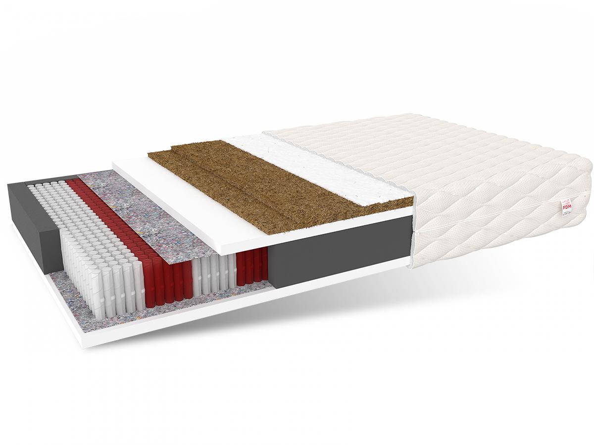 Specifikace: tvrdost: H4 tvrdá H5 velmi tvrdý tloušťka: 19 cm Složení: Klimatizační vlákno: 1 kus Kokosová vložka: 2x1 cm polyuretanová pěna T25: 2 cm, Obal: 1 cm Výška pružiny: 12 cm T25 polyuretanová pěna: 2 cm