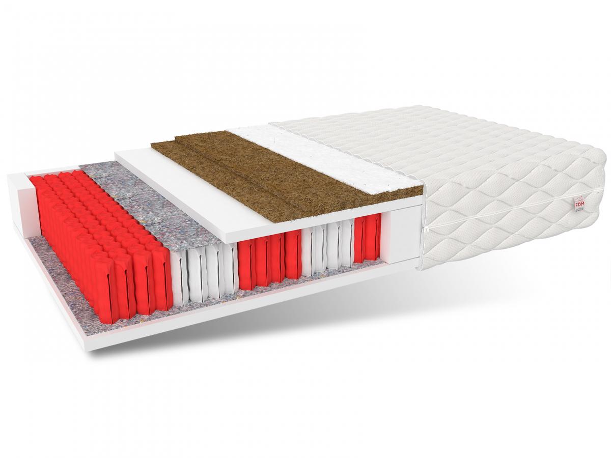 Specifikace: tvrdost: H4 tvrdá H5 velmi tvrdý tloušťka: 25 cm Složení: Klimatizační vlákno: 1 kus Kokosová vložka: 2x1 cm polyuretanová pěna T25: 2 cm Potah: 1 cm Výška pružiny: 18 cm polyuretanová pěna T25: 2 cm