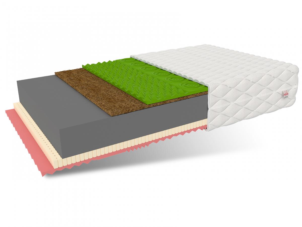 Specifikace: tvrdost: H4 tvrdá H3 středně tvrdý tloušťka: 22 cm Složení: Perforovaný latex: 2 cm kokosová vložka: 1 cm polyuretanová pěna T25: 14 cm obal: 1 cm profilovaná pěna V40: 2 cm vysoce flexibilní profilovaná pěna R44: 2 cm